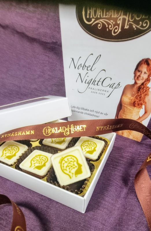 med kakaonibs och ”förseglat” med 2019 års Nobel NIghtCap-logga i vit choklad.
