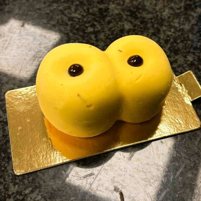 Lussebulle- Trompe l’oeil fruktbakelse . Saffransmousse med björnbärscoulis som vi tillverkar av björnbär från Nynäshamn. Doppad i vit choklad. Ser ut som en lussebulle och smakar som en härlig lussebulle med frisk smak av björnbär! Den superpopulära virala bakelsen. Otroligt god med ett härligt crunch från äkta choklad när man biter i den. Följt av len fluffig mousse och en kärna av björnbär.