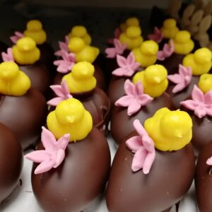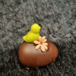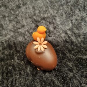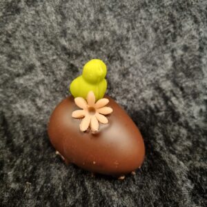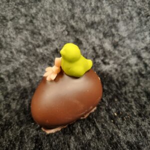 Handmodellerat marsipanägg – chokladdoppat och dekorerat med en marsipankyckling och en liten blomma.