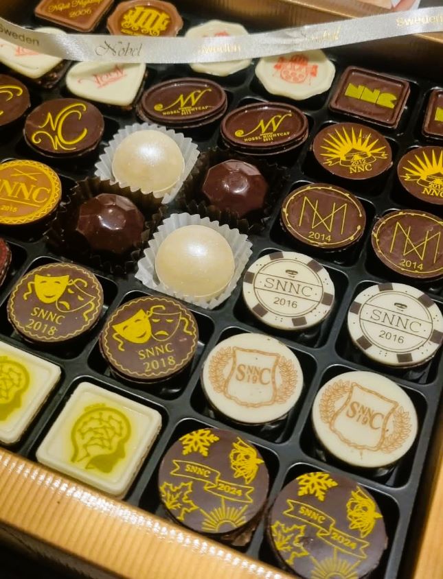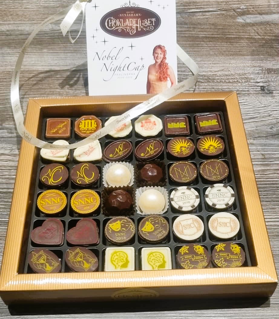 Efter att sekretessavtal skrivits med arrangören Nobel NightCap, -Festen som Nobel-pristagare och Nobelgäster eskorteras till efter middag och prisutdelning, så vi kan påbörja receptutveckling och tillverkning av den hemliga pralinen. Varje år innebär ett nytt hemligt tema – och en ny unik smak.