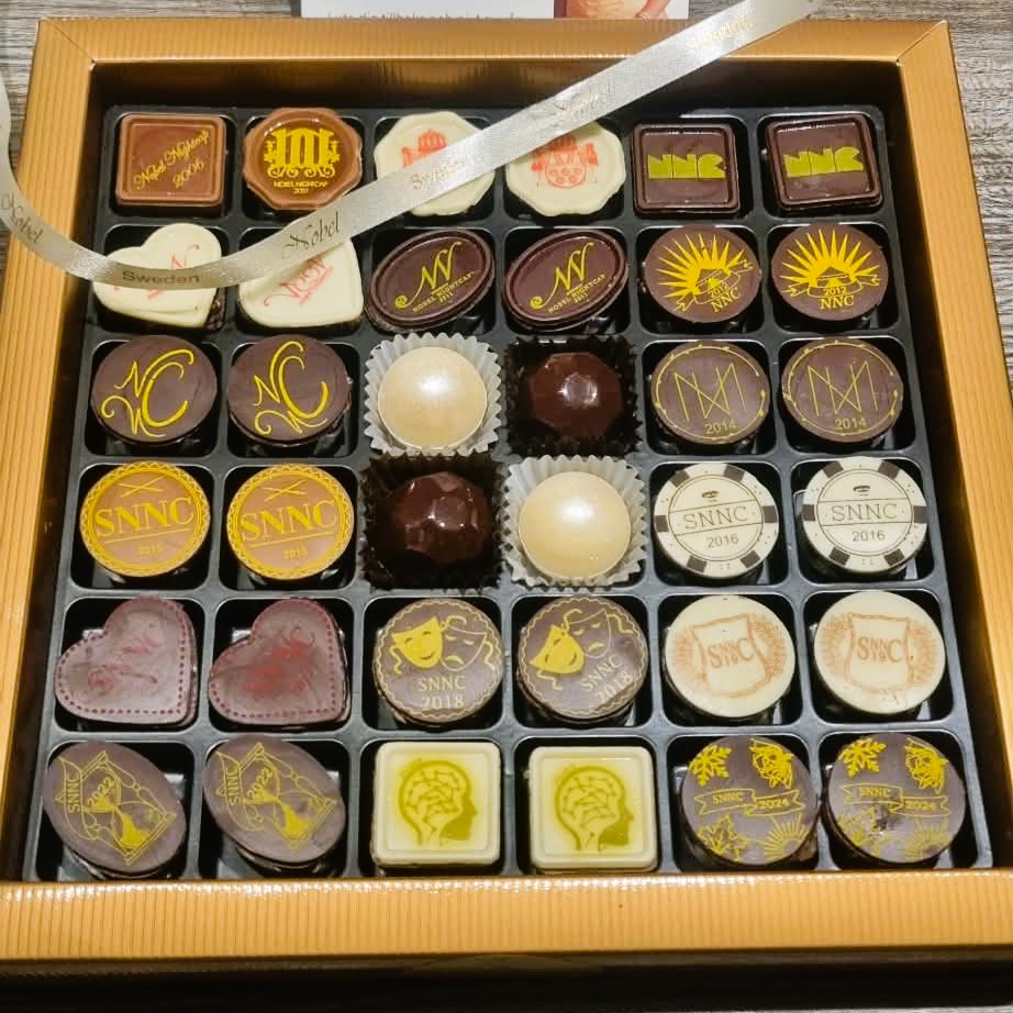Varför är just dessa så speciella? Jo, varje år sedan 2006 har vi ensamt fått det hedrande uppdraget att tillverka 2000 praliner till Nobelpristagarna och Nobelgästerna. Under flera månader arbetar vi intensivt med att ta fram en helt ny och unik pralin.