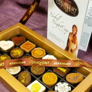 Efter att sekretessavtal skrivits med arrangören Nobel NightCap, -Festen som Nobel-pristagare och Nobelgäster eskorteras till efter middag och prisutdelning, så vi kan påbörja receptutveckling och tillverkning av den hemliga pralinen. Varje år innebär ett nytt hemligt tema – och en ny unik smak.