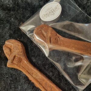 Dessa ”rostiga” verktyg tillverkar vi själva av  fin Belgisk mjölkchoklad med 34% kakaohalt. Det rostiga på verktygen är kakao.