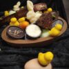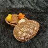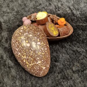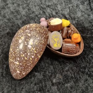 Påskägg tillverkat i ljus eller mörk choklad – 2 halvor fyllda med 9st påsk-inspirerade praliner + 4st marsipankycklingar.