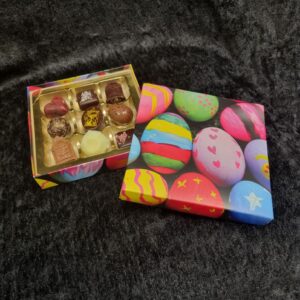 Härligt påskig chokladask med påskmotiv fylld med 9 olika praliner.